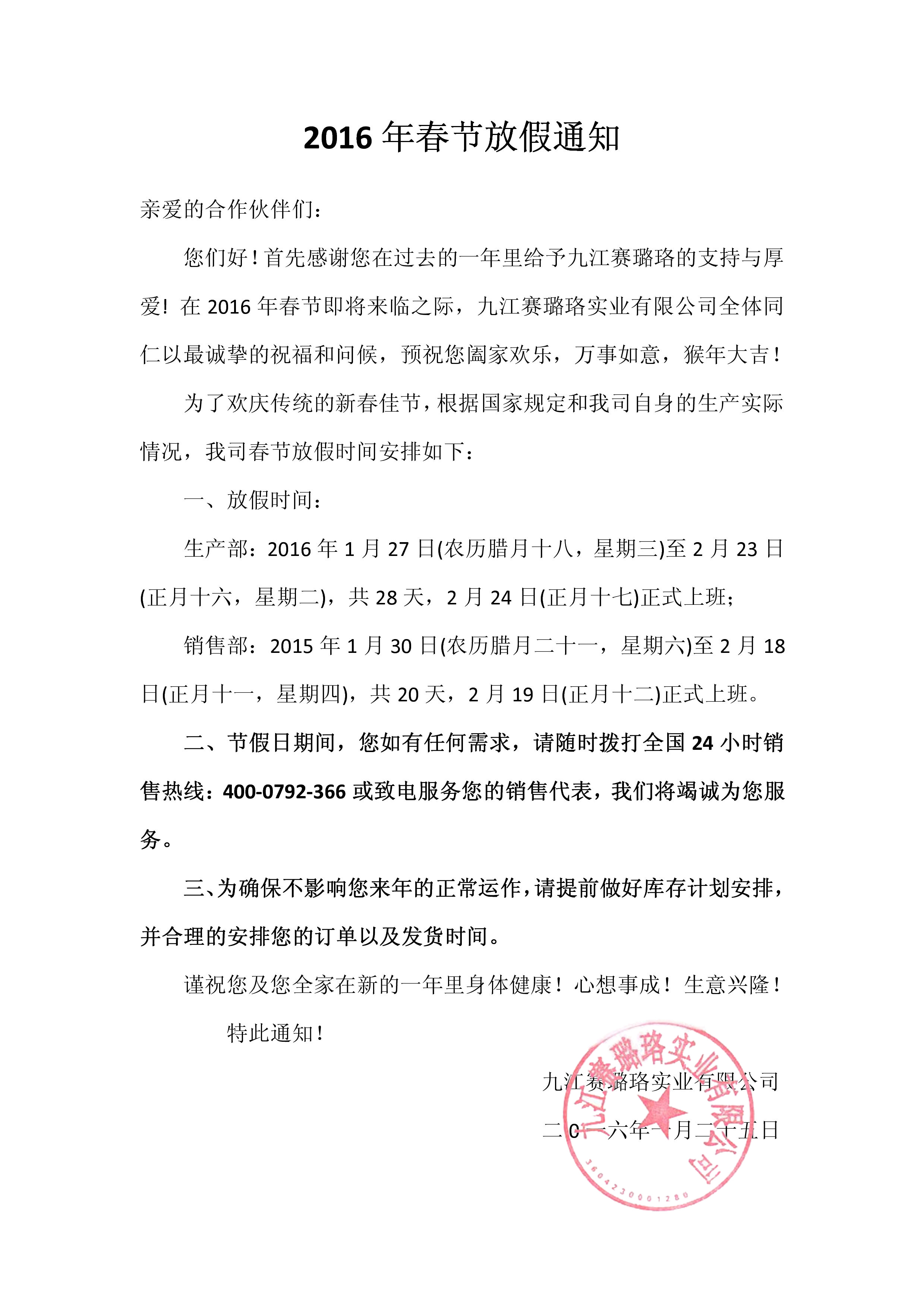 九江賽璐珞2016年春節(jié)放假通知